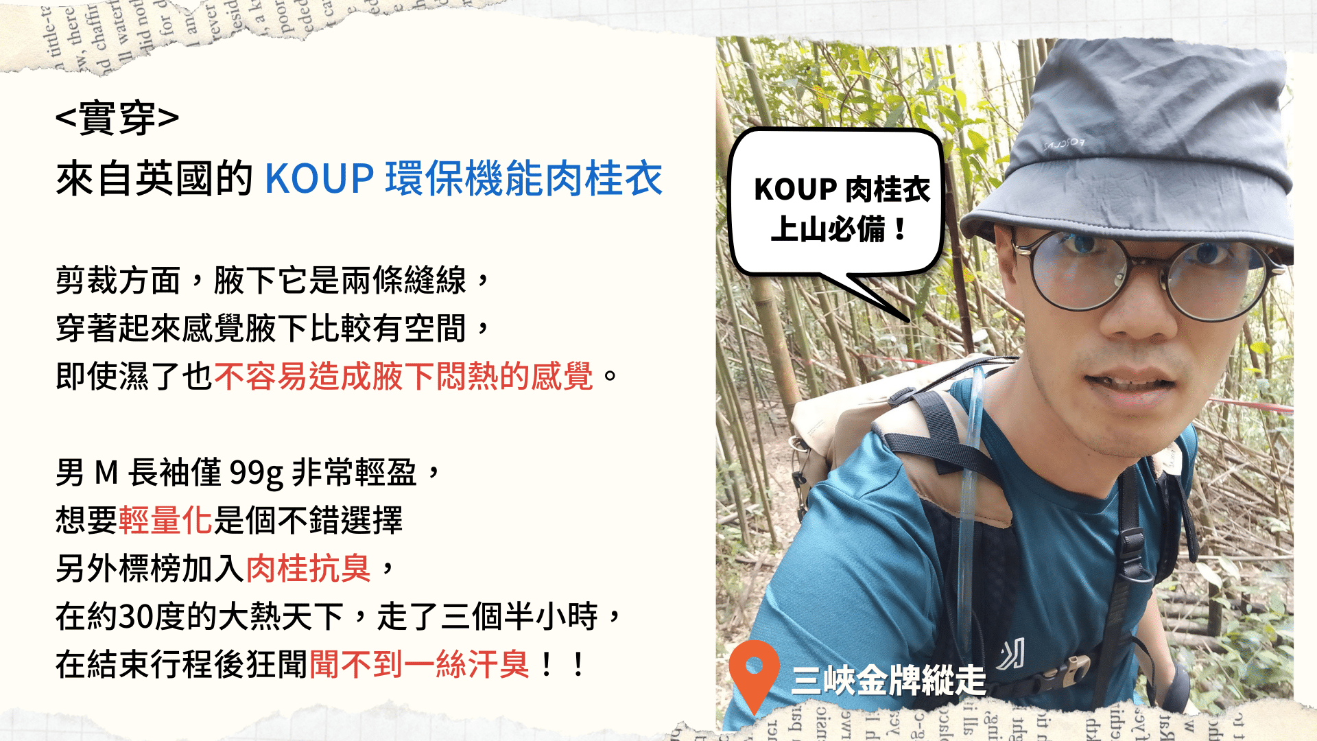 另外標榜加入肉桂抗臭,在約30度的大熱天下,走了三個半小時超會流汗且味道有時候自己也有點受不了的我,在結束行程後狂聞卻聞不到一絲汗臭,相當驚嘆,又驚喜。不用再害怕下山後要去用餐會影響到其他的客人。想必這件 KOUP 肉桂衣會是我接下來上山的必備衣服了。」