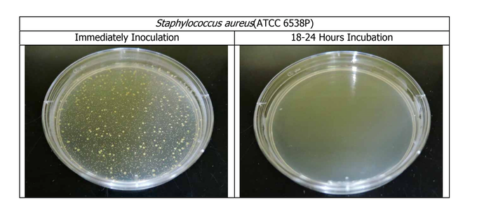 ▲ 抗菌測試:左圖中一點一點的都是金黃色葡萄球菌,右圖則是在接觸環保機能肉桂衣布料 18-24 小時候的反應,可以看到細菌都消失了!