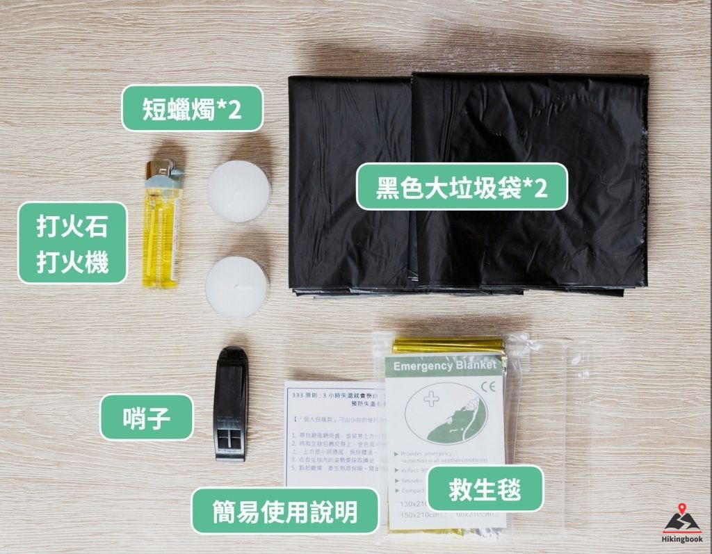 「個人保暖款」的刁山小包,內容物可作為單人擋風擋雨、預防失溫,包括以下六樣物品: